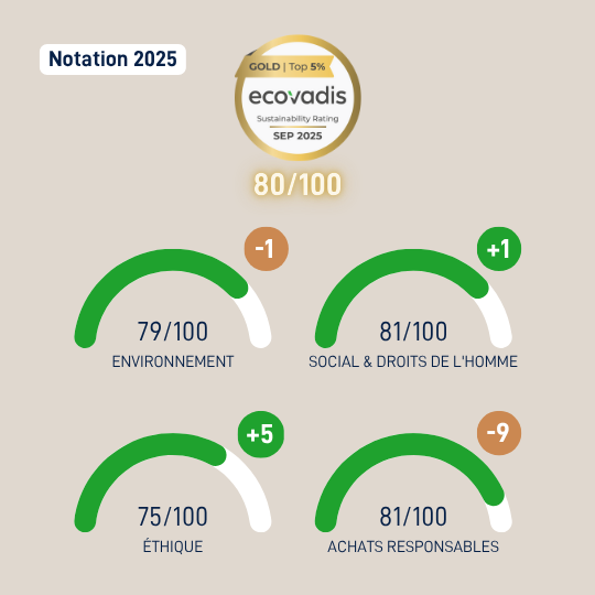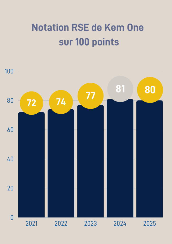 In 2025, Kem One was awarded the Ecovadis Gold medal for its CSR performance. With a score of 80/100 (-1 point vs 2024), Kem One maintains its level of CSR excellence, ranking among the top 3% of companies worldwide.